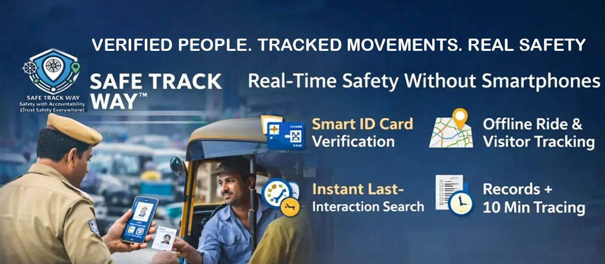 Safe Track Way™ addresses India’s offline safety gap through an internationally patented, offline-first verification infrastructure. It converts everyday offline interactions into secure, traceable digital records using Smart ID Cards issued after Aadhaar-based KYC. Each verified scan logs who interacted, when, and where—without requiring smartphones for service providers. A central Command & Control platform provides real-time visibility, analytics, and alerts for institutions and authorities. For law enforcement, Safe Track Way™ reduces Phase-1 investigation time from 5–6 hours to under 10 minutes, enabling faster response, accountability, and proactive crime deterrence.